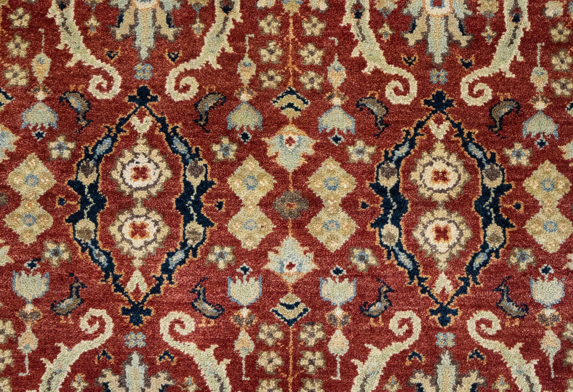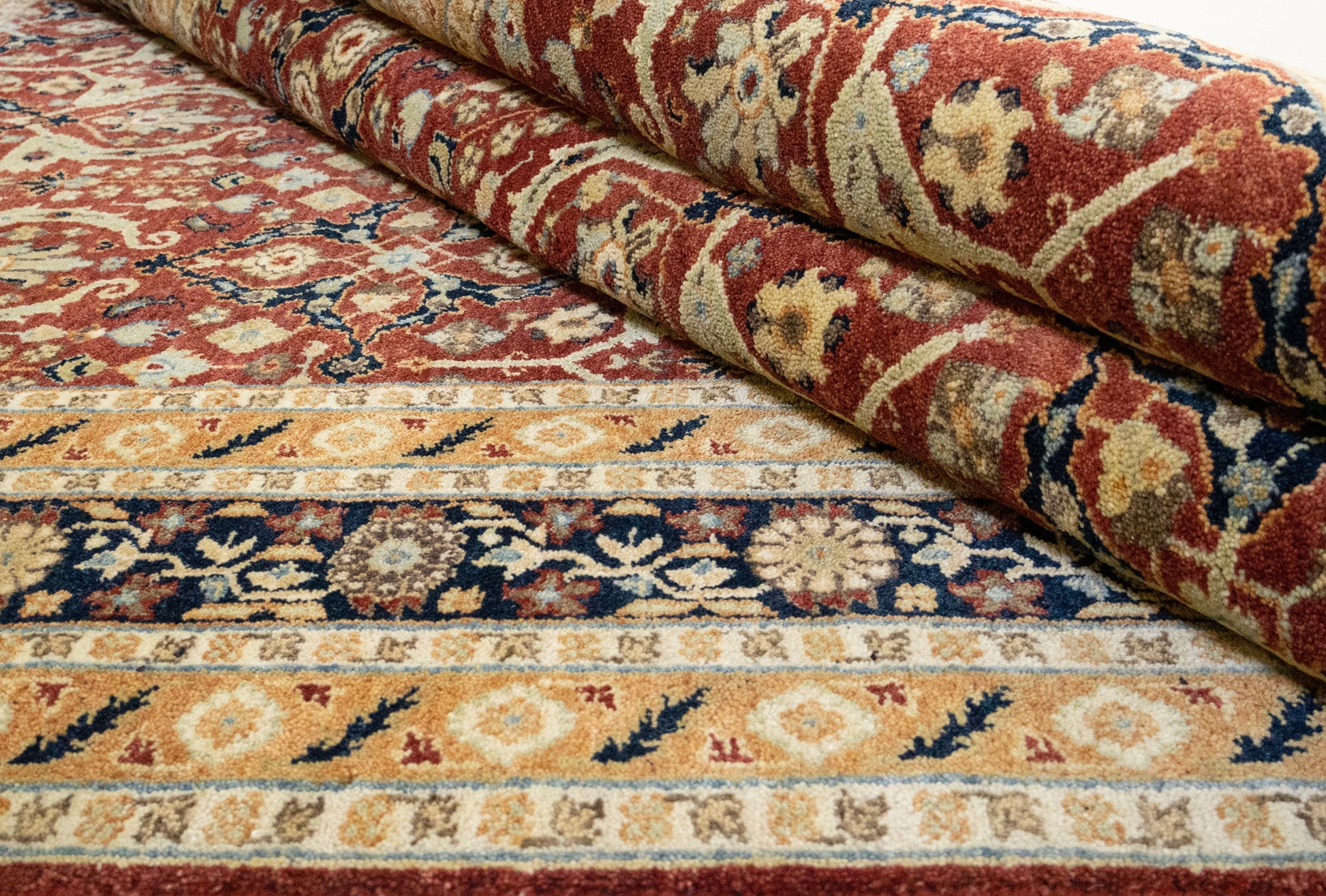 This exquisite carpet features a classic, hand-knotted design renowned for its intricate floral motifs and rich palette of burgundy, navy, and cream colors. Crafted from premium wool and natural dyes, the rug exemplifies exceptional craftsmanship and the timeless elegance of artistr. Its detailed pattern, featuring symmetrical medallions and ornate borders, makes it an ideal centerpiece in luxury interiors.